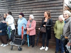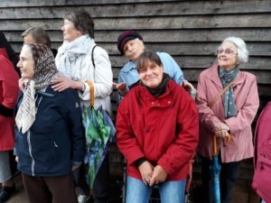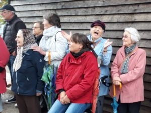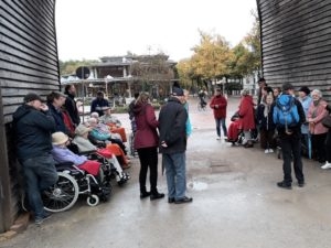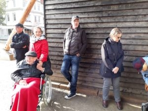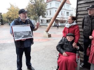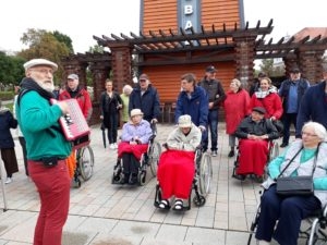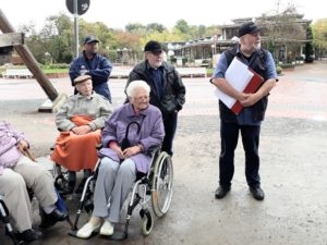 Da sich das Wetter leider nicht von der besten Seite zeigt, wurde der Rundgang zum Platz am Schliepsteiner Tor neu geplant. Den kurzen Halt im Schutz des ältesten Gradierwerkes nutze Jens Leuschner für seinen launigen Vortrag, der den Bewohnern viel Spaß bereitete und für ordentlichen Applaus sorgte. Er berichtete über die alten Badehäuser, den Teich mit der Stadtmühle, die Kleinbahn und vieles mehr. Die älteren Teilnehmer konnten sich sogar an Details auf den Bildern, mit denen der Stadtführer seinen Vortrag begleitete, sehr gut erinnern.