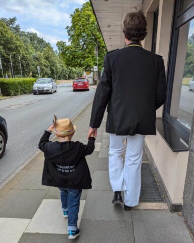 Um dem neuen Dienstrang auch äußerlich die rechte Autorität zu verleihen, bekam der frisch ernannte Oberst die passenden Schulterstücke überreicht. Um auch die Hosen „OBRISTEN tauglich“ zu machen, zückte der Vorsitzende kurzerhand eine Rolle rotes Isolierband und klebte die noch fehlenden roten Biesen an die Hosenbeine des Kommandeurs.