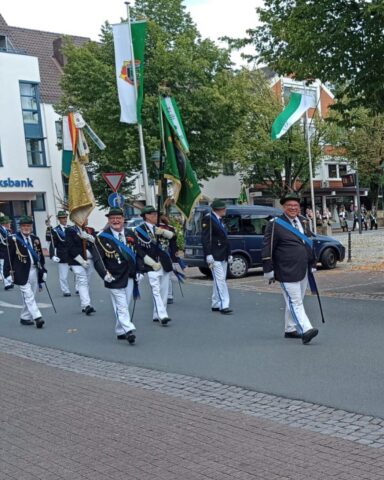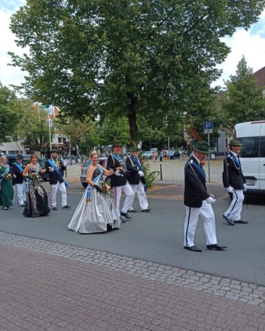 Am Festsamstag folgte die mit Spannung erwartete Proklamation der neuen Würdenträger im Schlosspark. Angeführt vom Spielmannszug Dornberg, marschierten die Schötmaraner Schützen, gefolgt von der Schützengesellschaft Bad Salzuflen, dem Schützenverein Nienhagen und einer Abordnung der 3. Kompanie des PzGrenBtl 212 aus Augustdorf, vom Sammelplatz am Schützenhaus zum Schlosspark. Bei bestem Wetter nahm der Festzug auf der Wiese vor dem Schloss Stietencron Aufstellung.