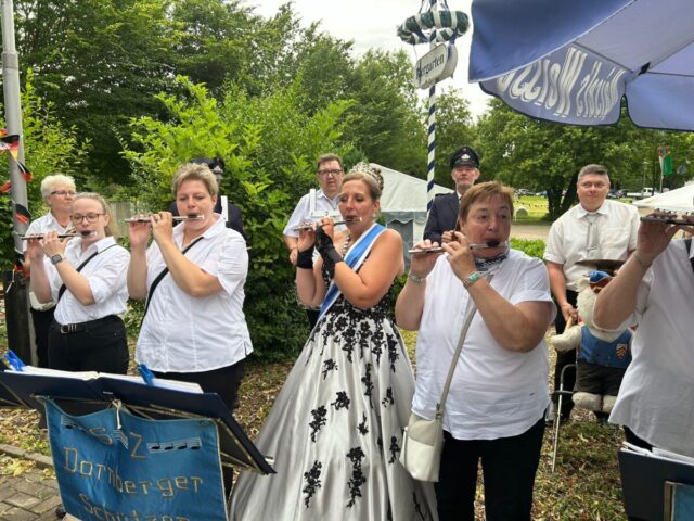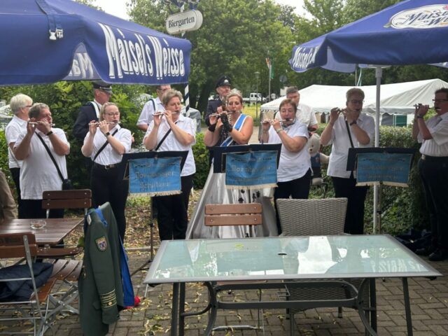 Parallel zu den Schießwettbewerben spielte die deutsche Fußballnationalmannschaft im EM-Viertelfinale gegen Spanien. Das Spiel konnte auf der Terrasse des Schützenhauses live verfolgt werden und nicht wenige Mitglieder und Festgäste fieberten mit der DFB-Elf. Entsprechend kurz fasste sich Kommandeur Jörg Balk in seiner Begrüßung, der um 18.00 Uhr vor dem Schützenhaus angetretenen Schützenschwestern und Schützenbrüdern.